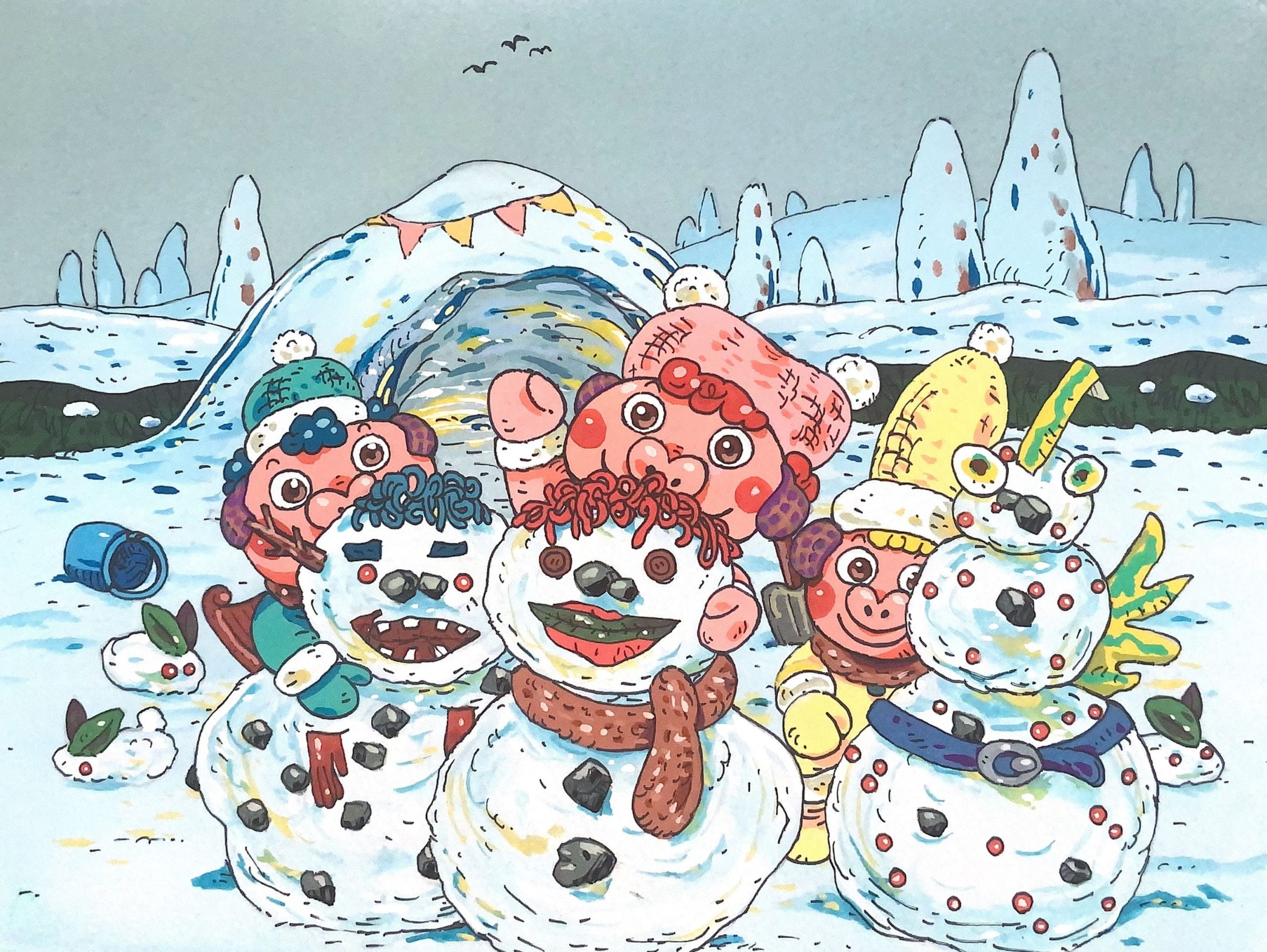 それからも、さんにんは、ゆきをあつめたり、かためたり、くっつけたり、けずったり。