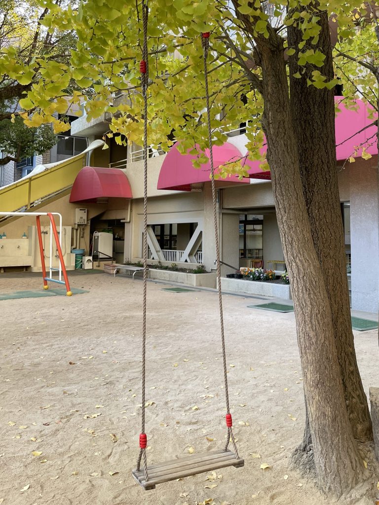 (左) 銀杏の木とブランコ。(右)楠の木とターザンロープ。