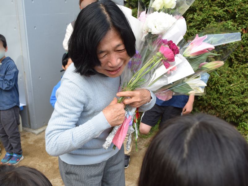 定年退職の知らせを聞きつけ、卒園生と保護者が次々と駆けつけた日。腕いっぱいの花束に包まれた石橋さん。